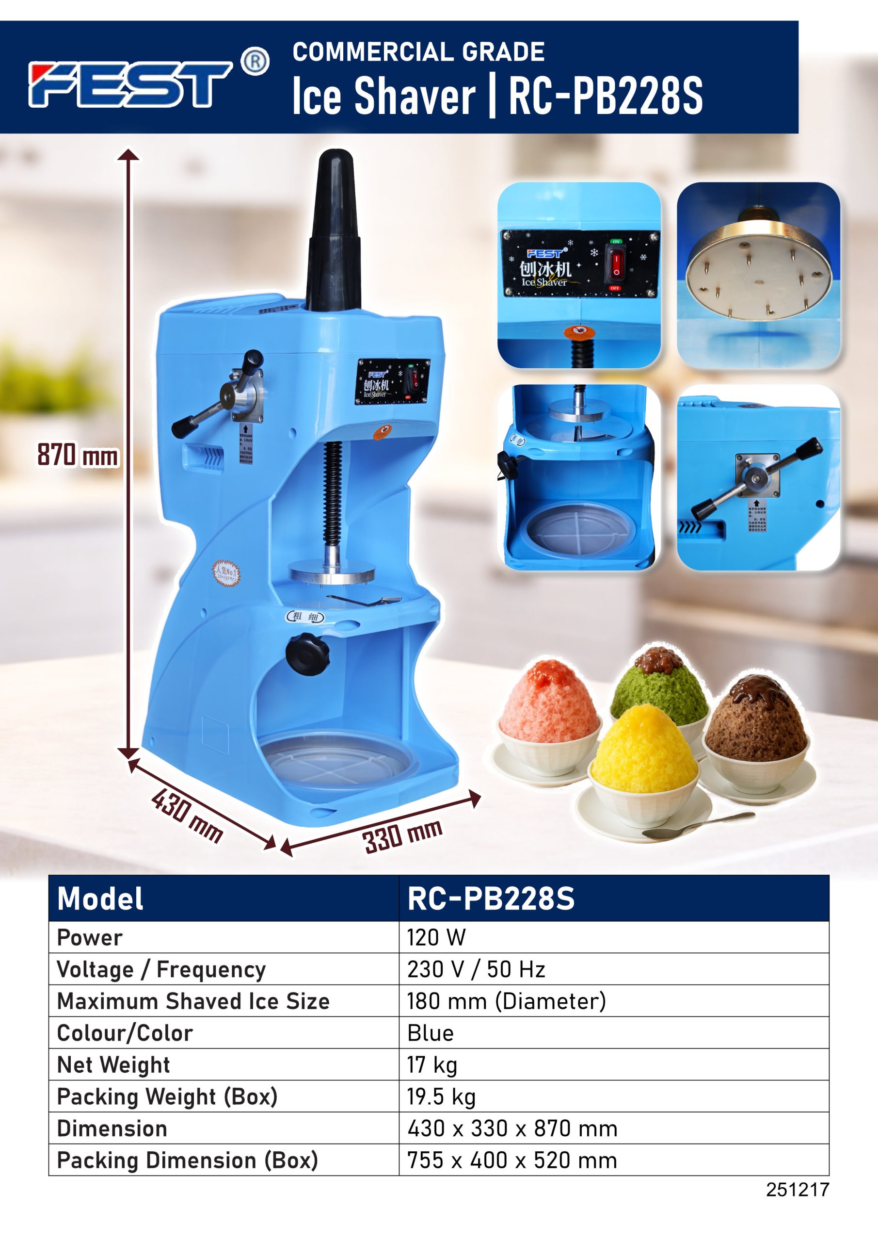 Max. Shaved Ice Size: 180 mm (Diameter)